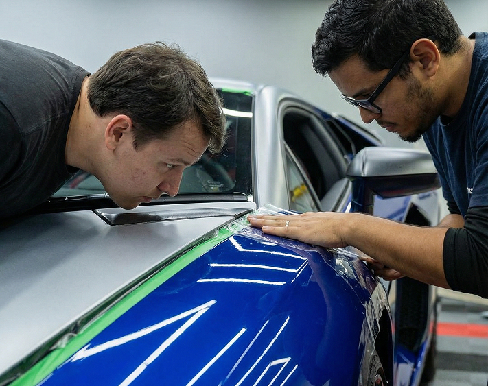 Ajuste detalhado de bordas, recortes precisos e inspeção completa do veículo, garantindo um resultado limpo, sofisticado e alinhado aos mais altos padrões estéticos.